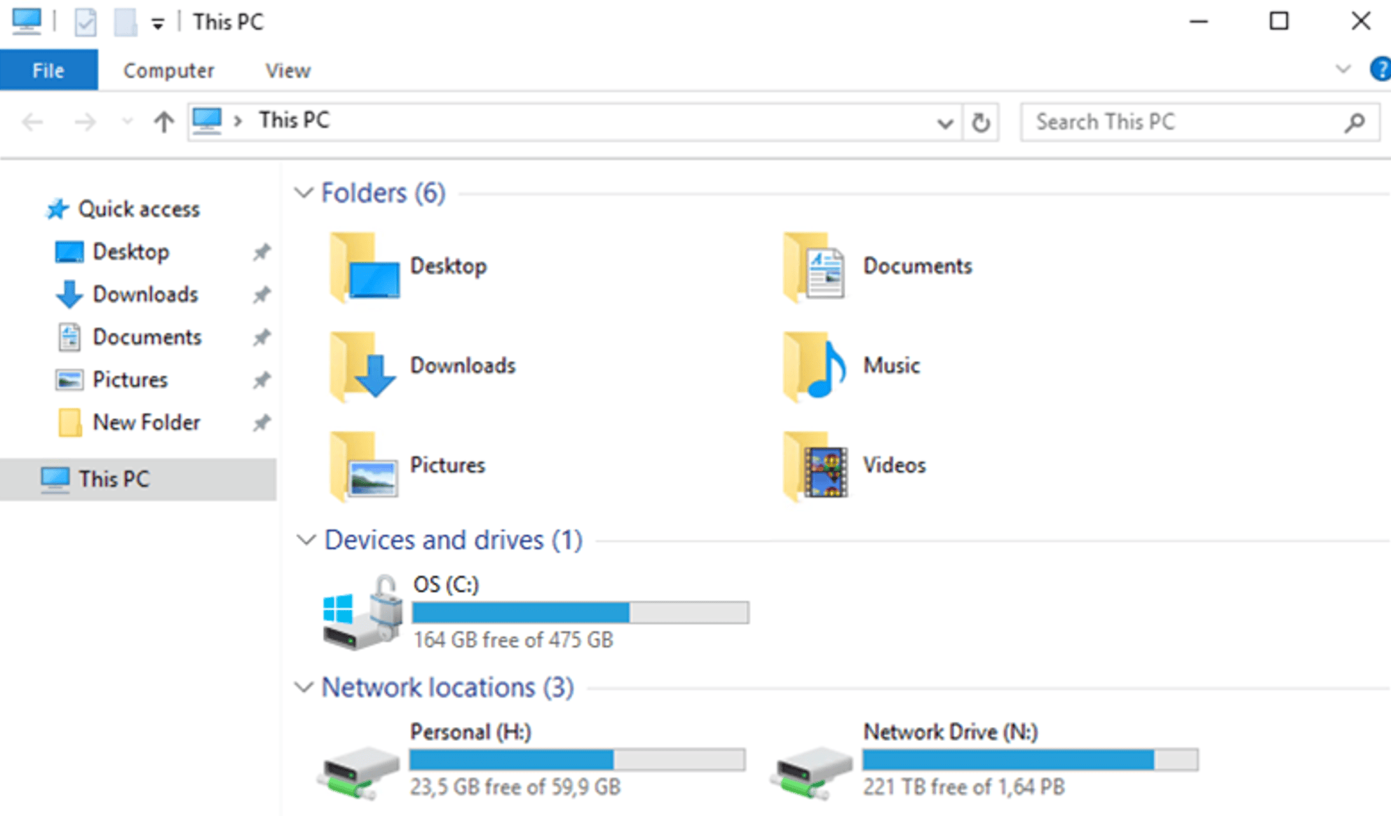 It is possible to reach personal home drives as well as the company’s common drives via File Explorer. File Explorer can be found in Start Menu.