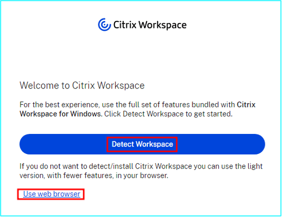 Users will be prompted to choose to use the Citrix Workspace Desktop application (Detect Workspace) or continue in the web browser (Use web browser). Using the Citrix Workspace Desktop application (see Chapter 2) is recommended, the web browser version is less stable.