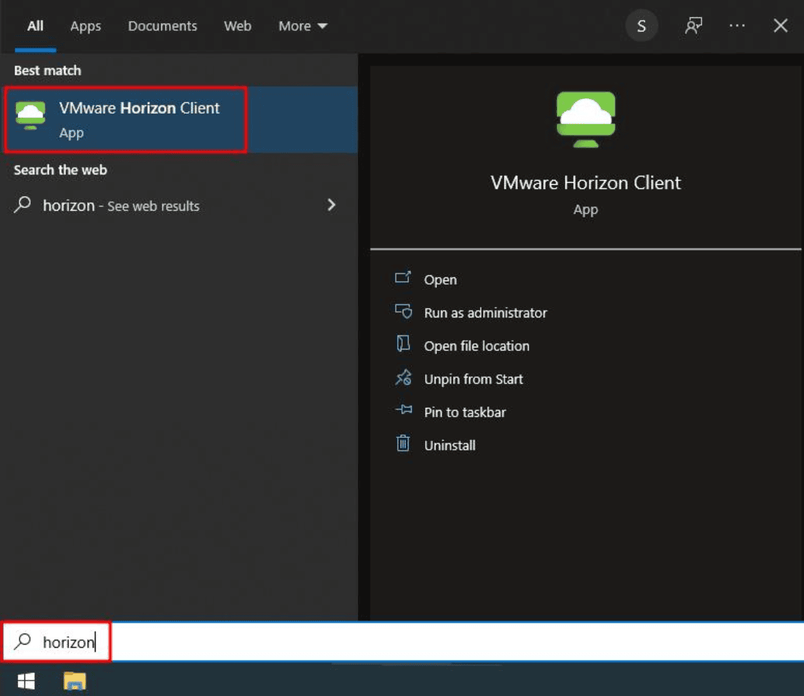 Launch VMware Horizon Client from the Start Menu shortcut or search for it: